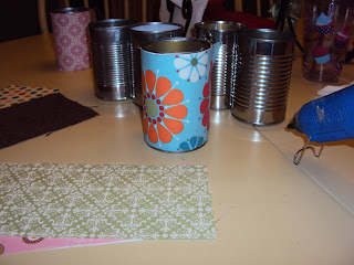 Then, you will want to get some spray adhesive, cardstock and the fabric that you want to use. You could easily substitute scrapbook paper here too! I cut out my fabric and cardstock to the correct size to wrap and sprayed the cardstock, laying the fabric on top of it. Make sure you do it this way instead of the reverse, it will make the fabric all sticky and hard to control. The double layer is important since the cans are "ribbed" and could make a single layer of fabric or paper look kind of messy.
